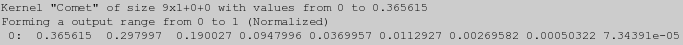 Disk' カーネルの実際の値を次に示します...カーネルのみを表示したかったため、画像処理は全く気にしません。そのため、形態学の「イテレーション」を「0」(何も実行しない)に設定し、null:出力ファイル形式を使用して画像の結果を破棄しました。上記にある特別な浮動小数点値「nan」は、ユーザー定義カーネルを入力する場合と同じ意味を持ちます。「数値ではない」ことを意味し、近傍の一部ではないカーネルの部分をマークします。これらの値は、すべての形態学演算によって無視されます。別の例を次に示します。今回は「Comet」畳み込みカーネルです。これは実際には1次元ガウス曲線の半分(シグマ1.0)であり、ImageMagickからそのような曲線を抽出する良い方法を提供できます。また、この特定のカーネルの「原点」(影響を与えるピクセル)は中心からずれている(+0+0にある)ことに注意してください。これはあまり一般的ではありません。出力の値のサイズと間隔は、特別な精度演算制御で制御できます。これは、形態学演算子とほぼ同時にIMに追加されました。たとえば、デフォルトの6桁から3桁に有効桁数を制限するために「-precision」を使用して、前の例を繰り返します。